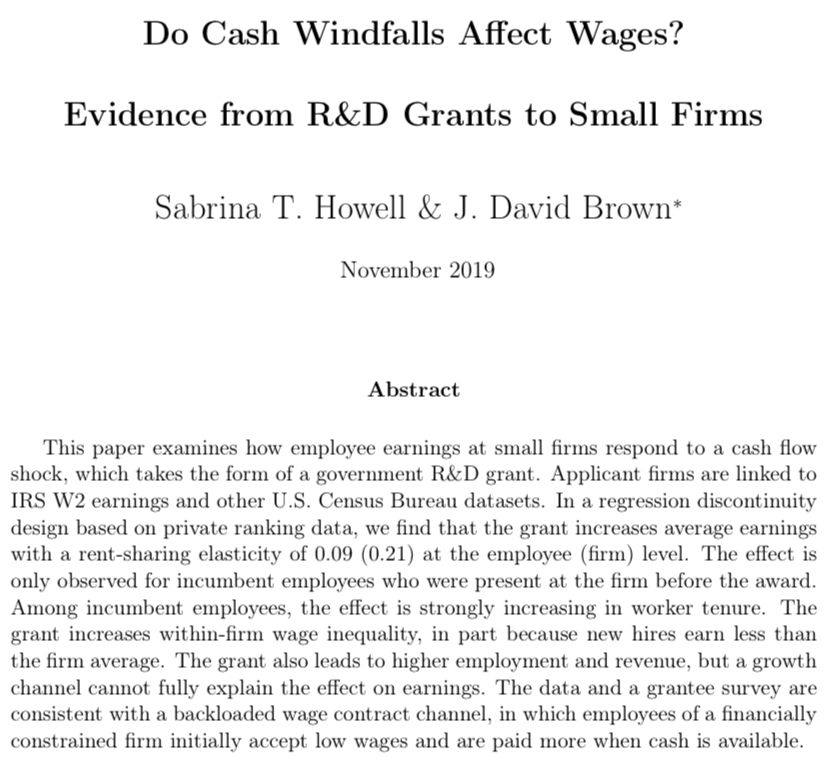 Competitive grants to SMBs: - $150K for proof-of-concept - ≤$1M followup Applying takes 1–2 months of FTE work, and program officials rank applications. Data: 270 competitions; 4,300 applications; 800 winners. (~3 of 16 win each competition). Link to IRS W2 and LBD. #FRA20