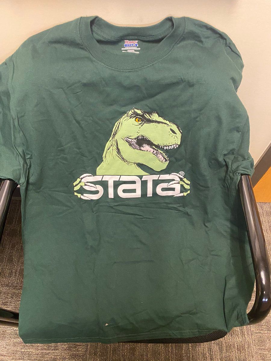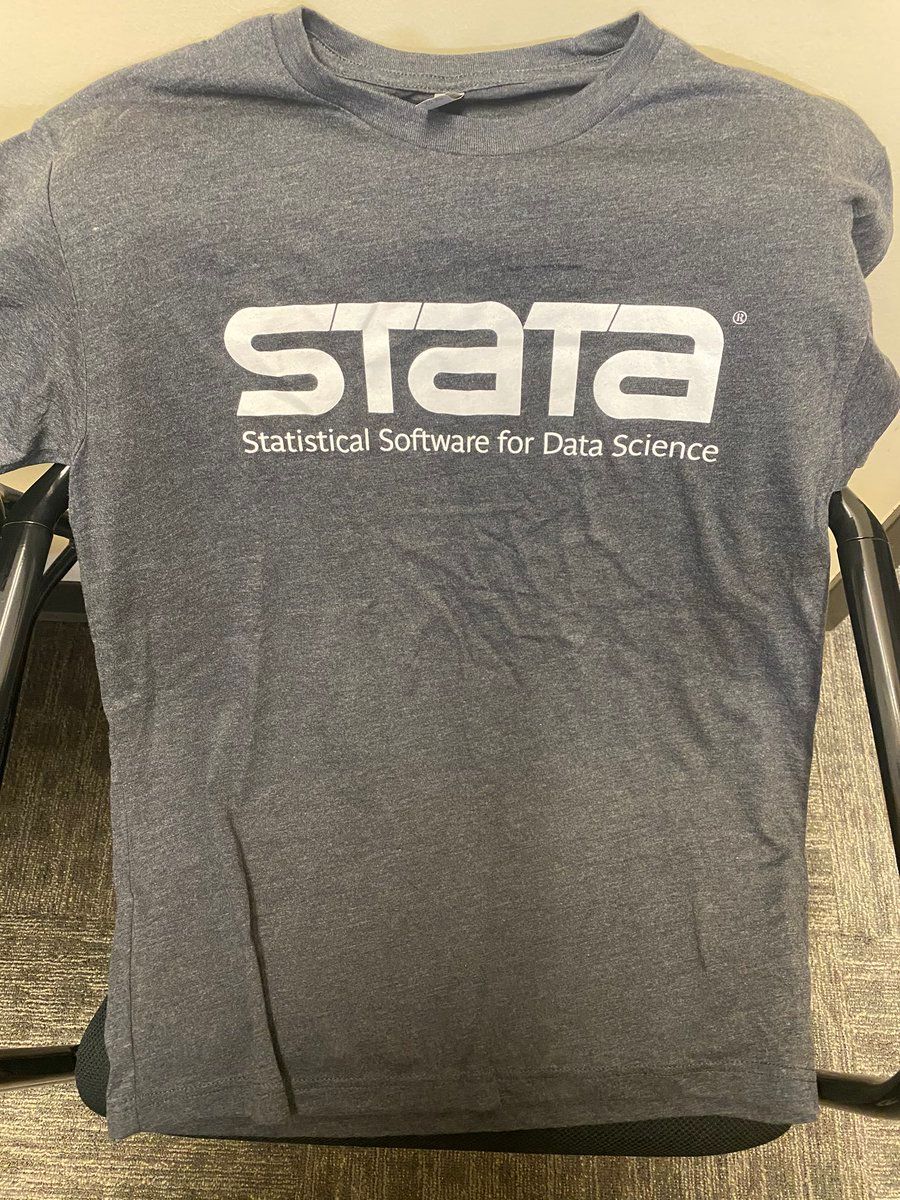 Cleaning out my office and happy to send (never-worn) @Stata t-shirts to three JMCs who use Stata in their JMP. First-come first-served in the replies; please include a link to your website/CV with a US mailing address. One each of WS (black), ML (grey), and MXL (green).
