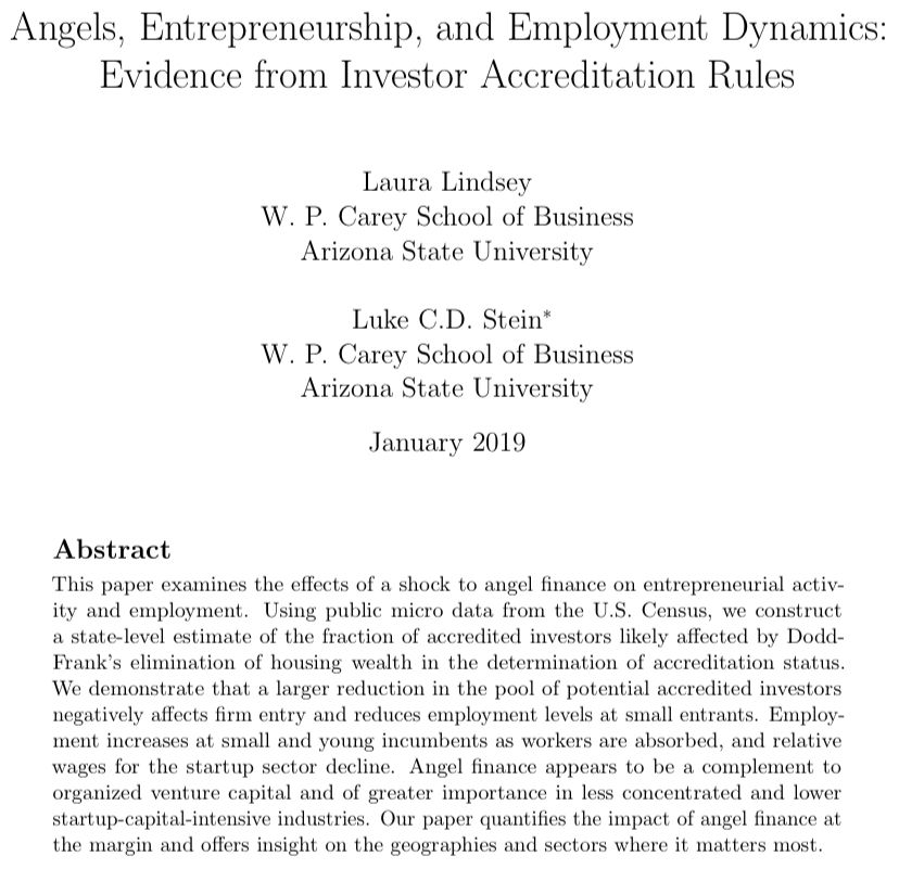 My working paper with Laura Lindsey suggests that loosened accredited investor standards may increase entrepreneurship. (Updated version coming soon.) faculty.babson.edu/lcdstein/research/lindsey-stein-angelsentrepreneurship.pdf We’ll need time/data to assess these new proposals👇—followup paper c. 2025? @SEC_News/1207351343167524864