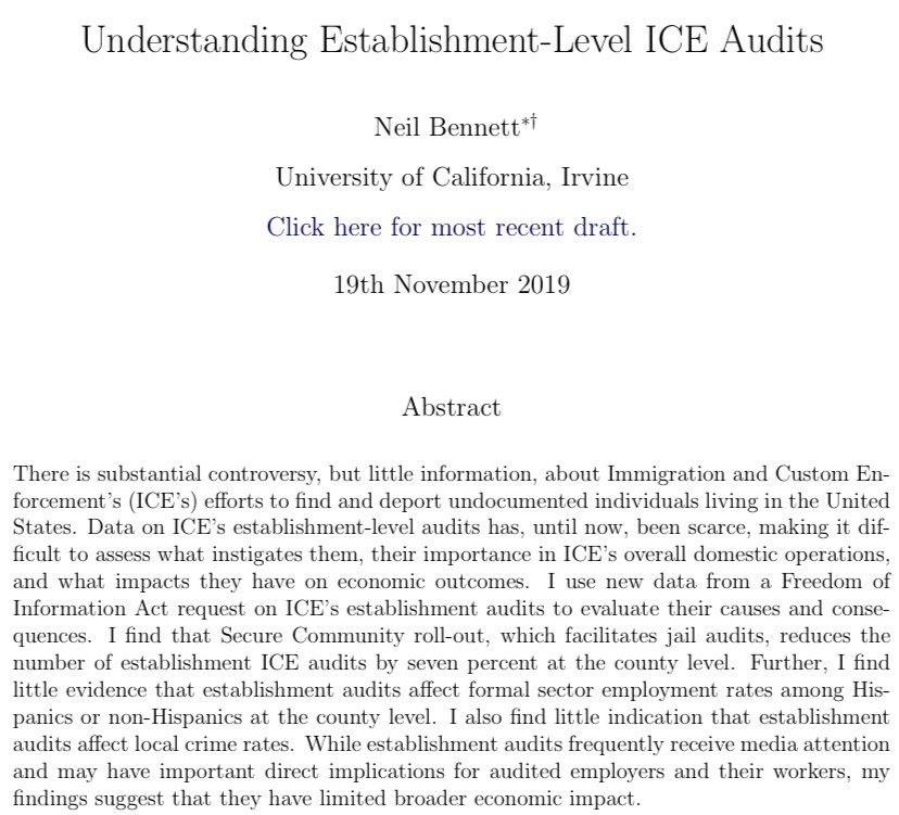 Neil is at UCI specializing in migration and immigration policy. Her JMP suggests that ICE audits don’t necessarily affect (local) formal-sector employment or crime rates. Good luck on the market, Neil! (Eh; we all know it’s perfectly efficient and luck plays no role, right? 🙃) t.co/Gnq63r9OUc