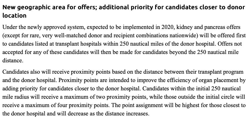 🚨RDD alert🚨 Kidney and pancreas transplants will now give priority to candidates within 250 nautical (!) miles. H/T Al Roth. Al Roth! marketdesigner.blogspot.com/2020/01/deceased-donor-organs-and-nautical-miles.html