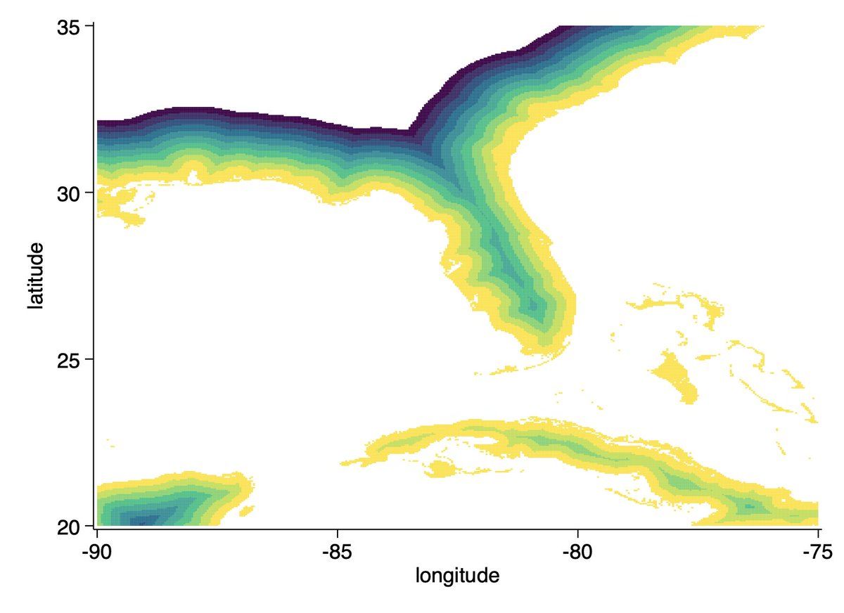 @JedKolko And with Ben Jann’s great -heatplot- heatplot distance latitude longitude if inrange(latitude, 20, 35) & inrange(longitude, -90, -75) & (distance < 0) & inrange(distance, -200,0), xdiscrete(0.04) ydiscrete(0.04) cuts(-200(20)0)