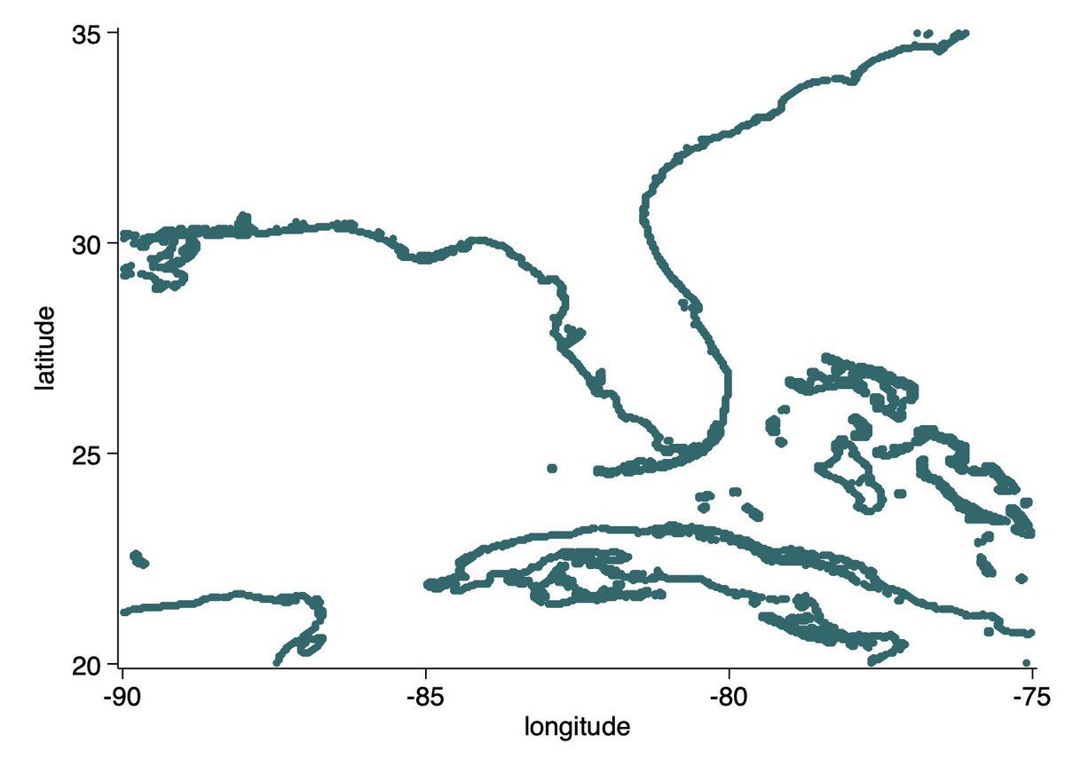 @JedKolko I love doing these! Here’s working with some data on distance from the ocean: scatter latitude longitude if inrange(latitude, 20, 35) & inrange(longitude, -90, -75) & inrange(distance, 0,5), msize(tiny)