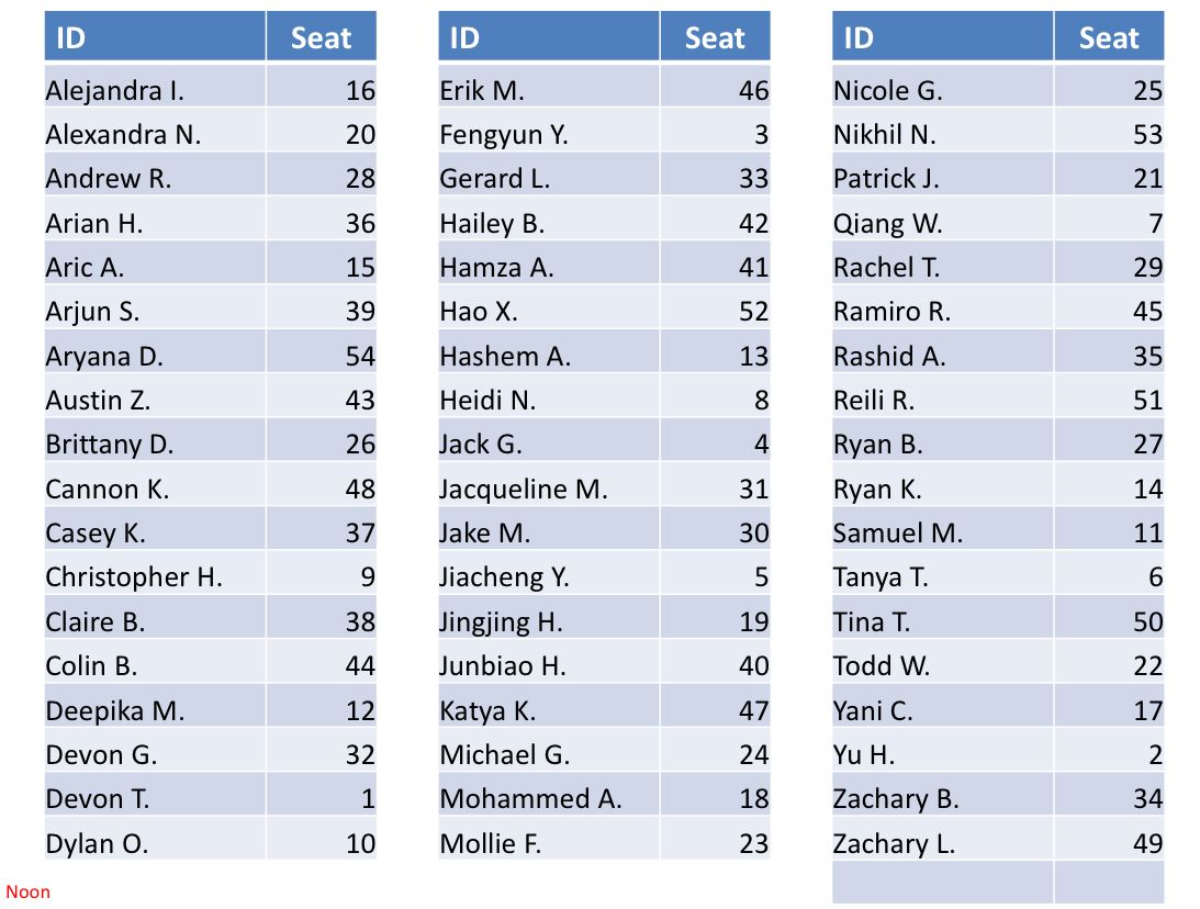 * I override randomization—without announcement—when there are (1) particular students about whom I have cheating concerns → front row or (2) any student’s advance request to sit somewhere particular, typically anxiety/PTSD-related → back row
