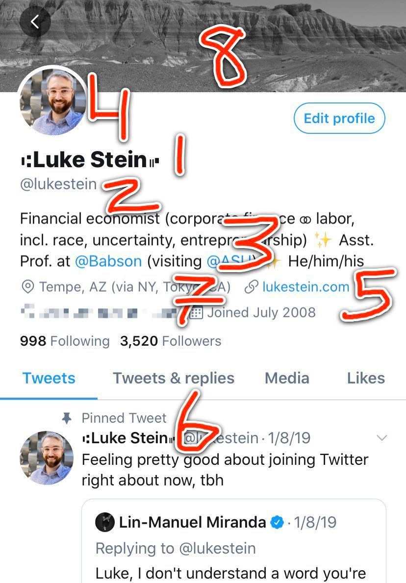 Twitter tip: You have eight ways to customize your profile (numbered👇 roughly most to least important). Especially if you’re trying to maintain a professional/semi-profession presence on this optional website, use ALL eight to ensure people see you the way you want to be seen.