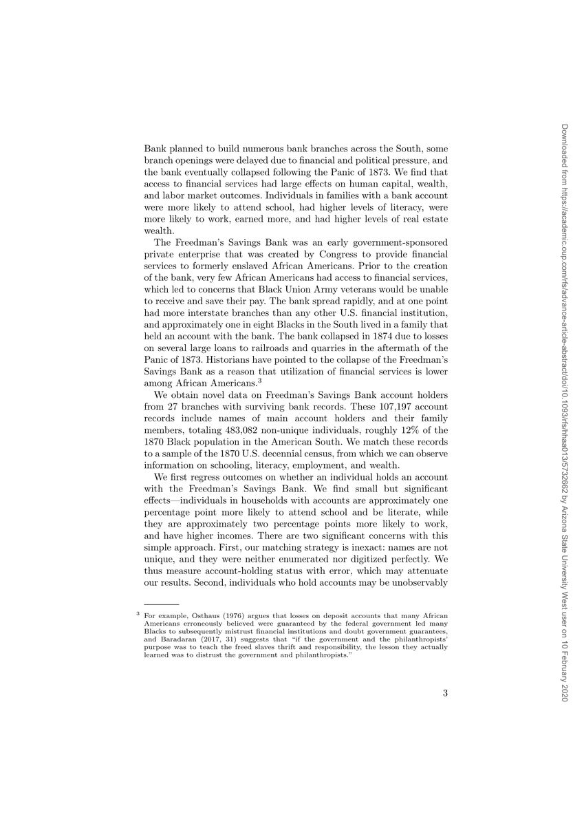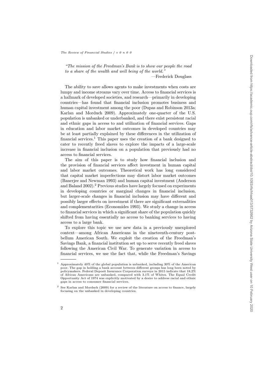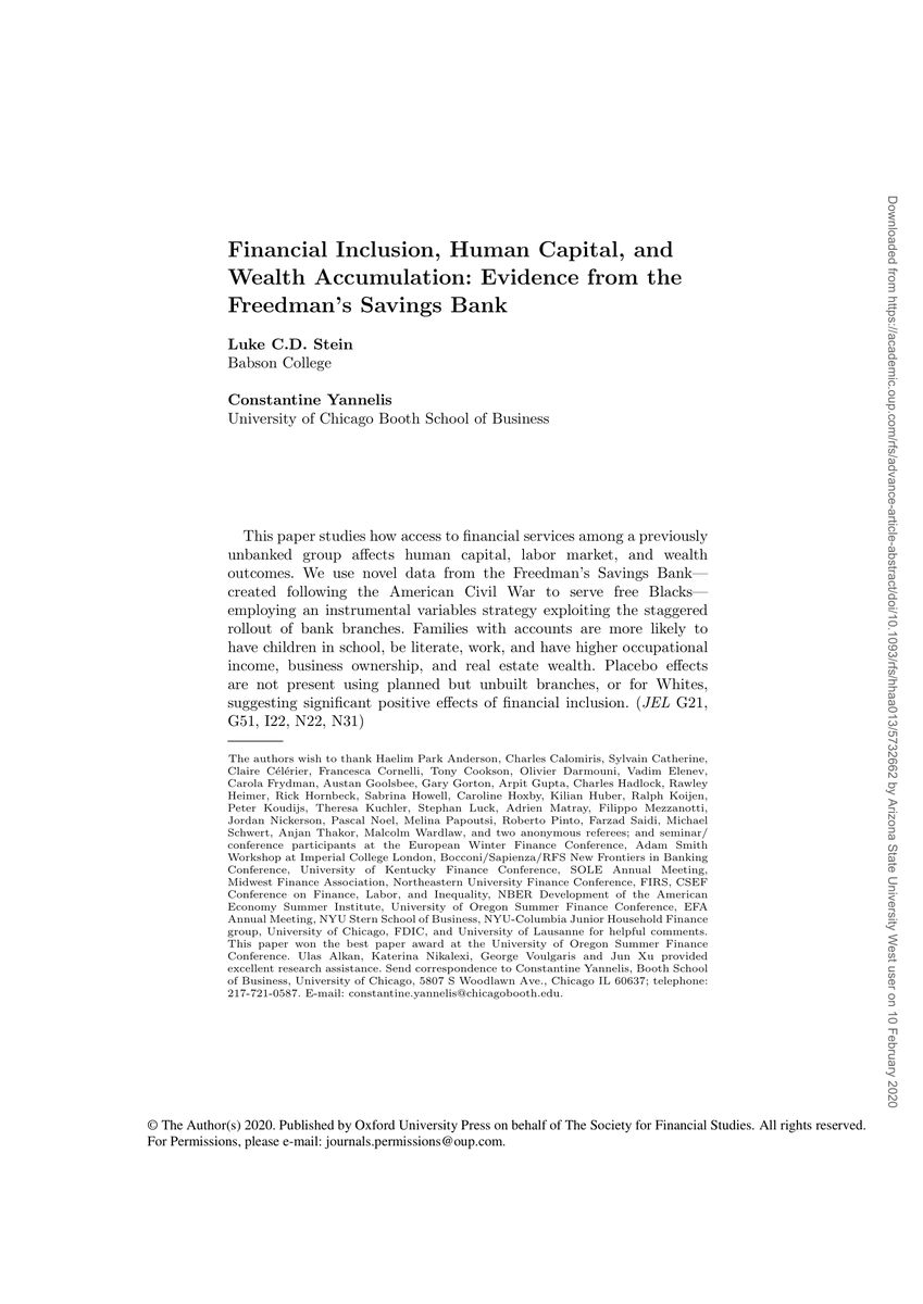 I am absolutely thrilled that my paper on the Freedman’s Savings Bank is now up on the RFS website with their February (Black History Month!) “Accepted Manuscripts” release. A thread. 1/8 @RevOfFinStudies/1226884440330317824