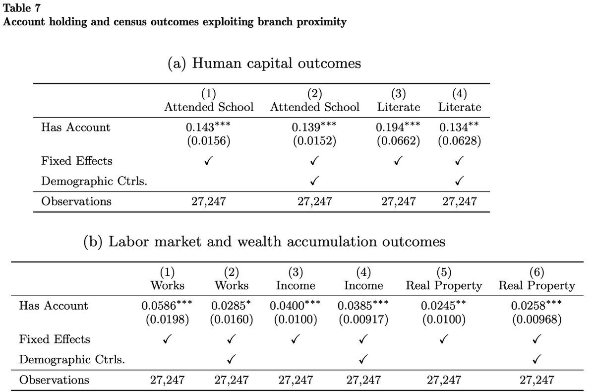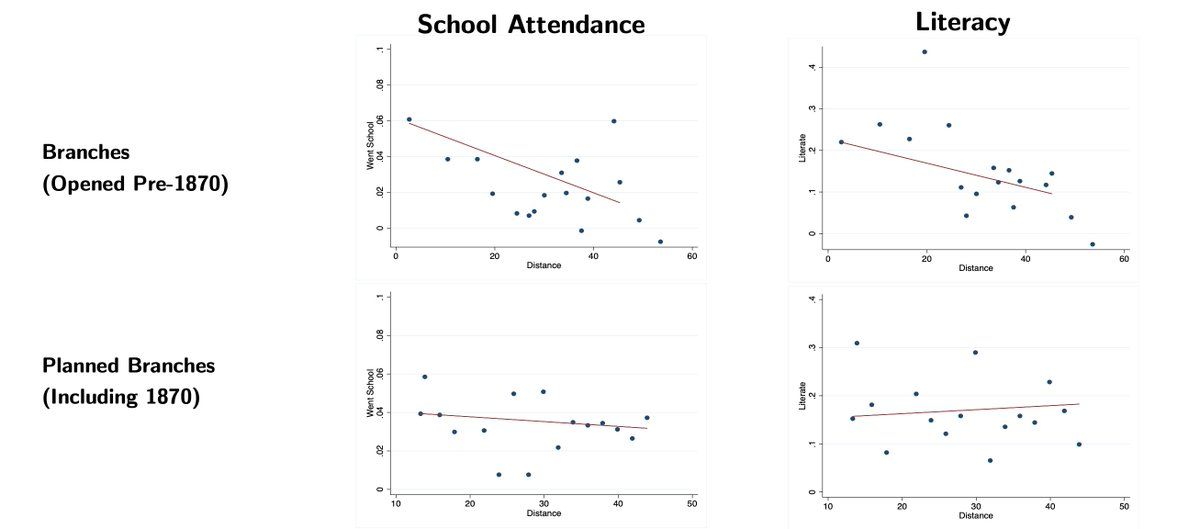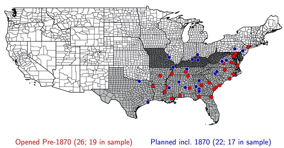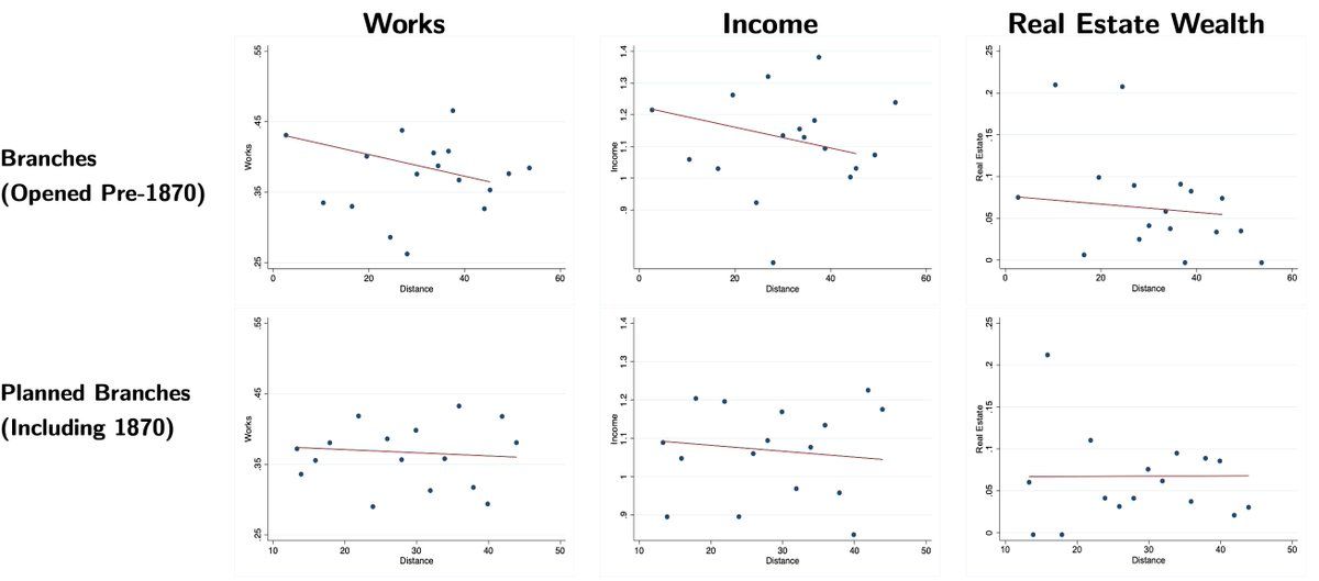 To understand 𝘴𝘩𝘰𝘳𝘵 𝘳𝘶𝘯 effects of access to banking, we use variation in 𝘄𝗵𝗲𝗻 branches opened (some early, some late, some planned but never opened) and 𝘄𝗵𝗲𝗿𝗲 people lived relative to a branch. Matched account opening records to 1870 Census data from @ipums. 3/
