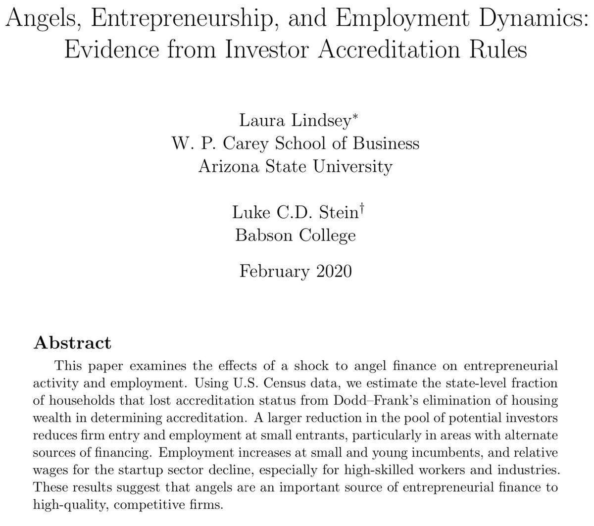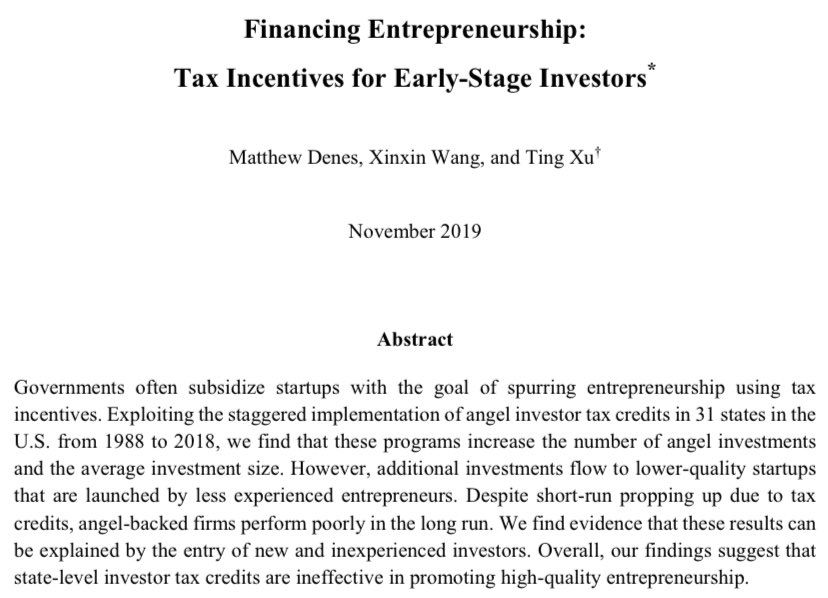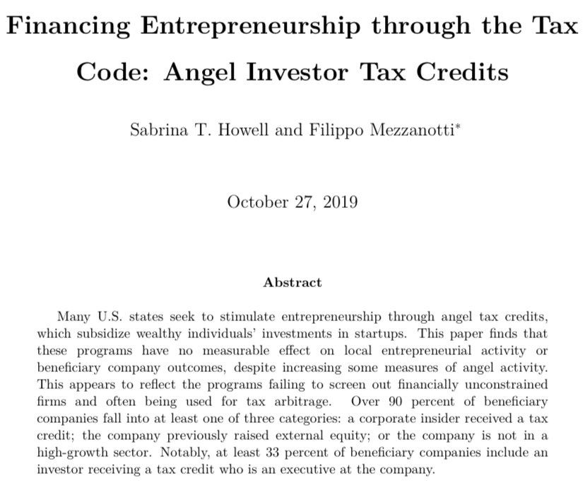 [6 cont] A nice discussion from @filomezza, whose paper with Sabrina Howell kellogg.northwestern.edu/faculty/mezzanotti/documents/tax_credit_hm.pdf finds many similar answers where their questions overlap. Increase in “angel activity,” but inframarginal population may NOT be the “right” ones (for some policy goals)?