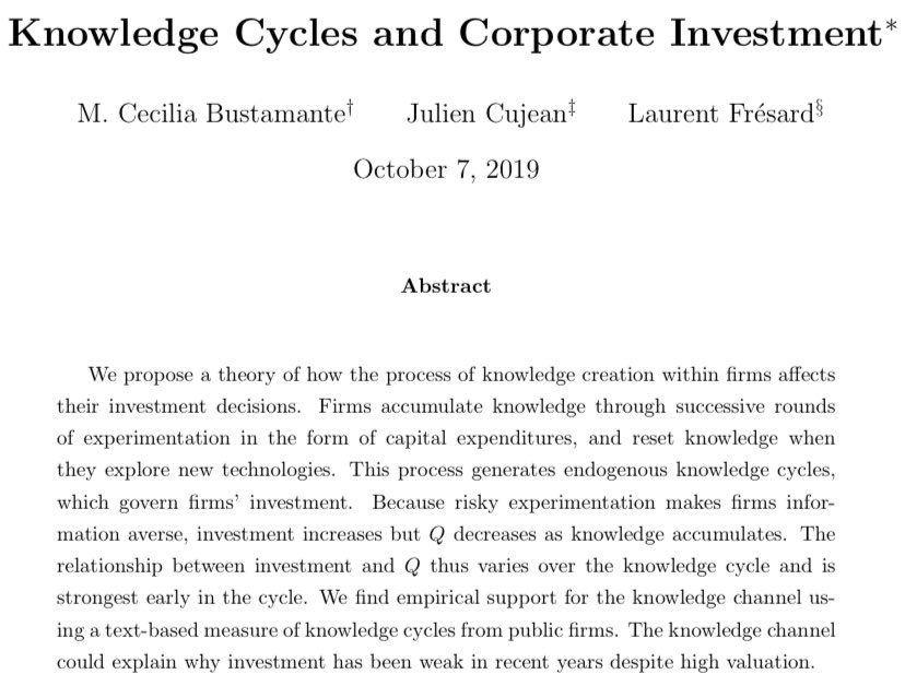 [7] Knowledge Cycles and Corporate Investment (@mcecibustamante et al): How does knowledge (an increasing share of firms’ assets) interact with physical investment? Model where knowledge NOT a typical input to production, but rather an OUTCOME of economic activity (cf Arrow 1969)