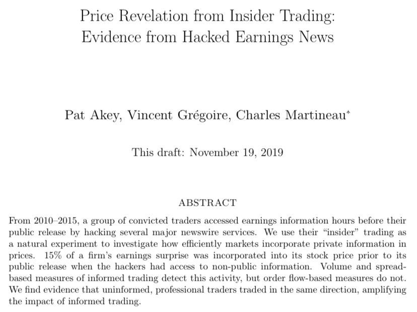 [8 cont] @FosVyacheslav with a nice discussion that connects explicitly to recent work on race bias in policing! @jonmummolo/1219694149424861184 Unlike many papers on insider trading, there’s data here on a number of *potentially* hacked announcements.👍