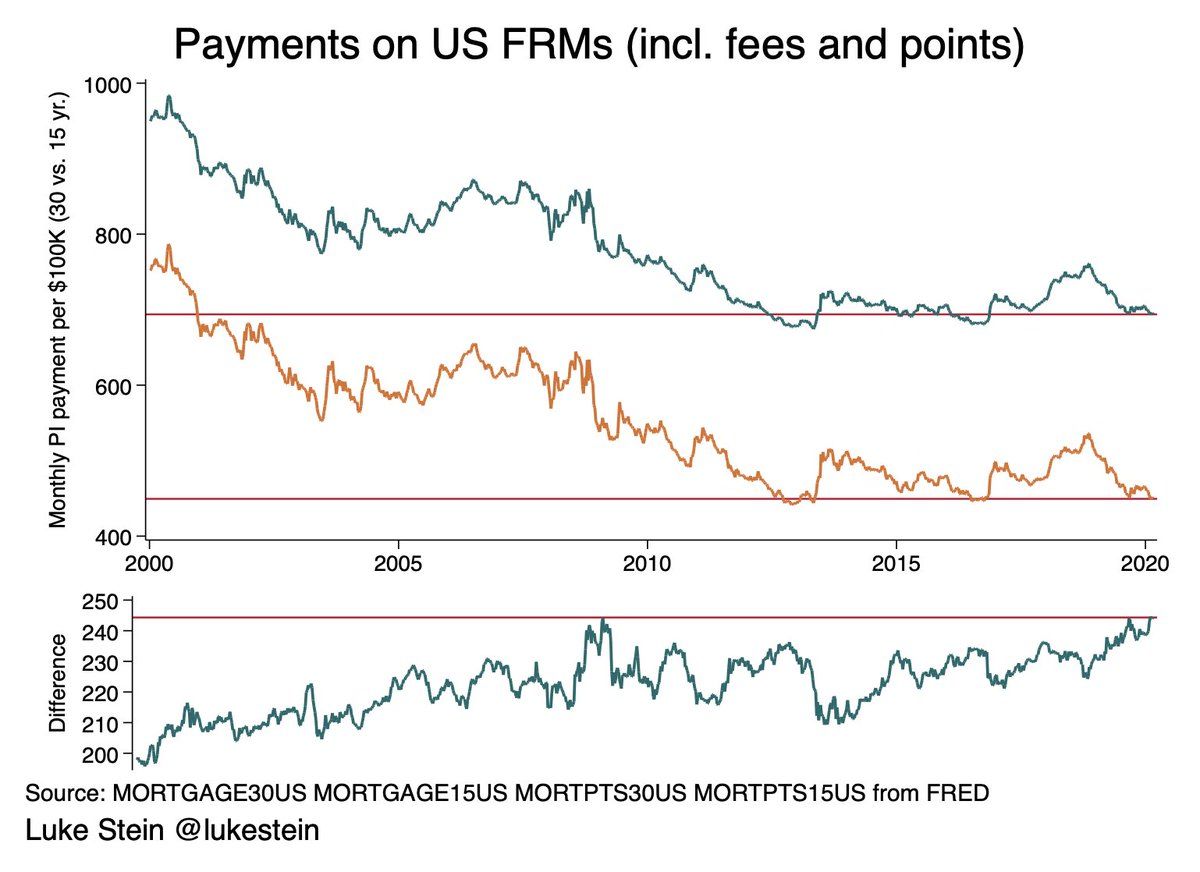 @radiosmith @daniel_egan But… counterpoint! 30yr mortgages aren't just cheap right now, they're *particularly* cheap relative to 15yr And with rates so low, not crazy to borrow as long as possible (and you may have this mortgage a while; can't count on better refi rates soon) @lukestein/1136344958917472256