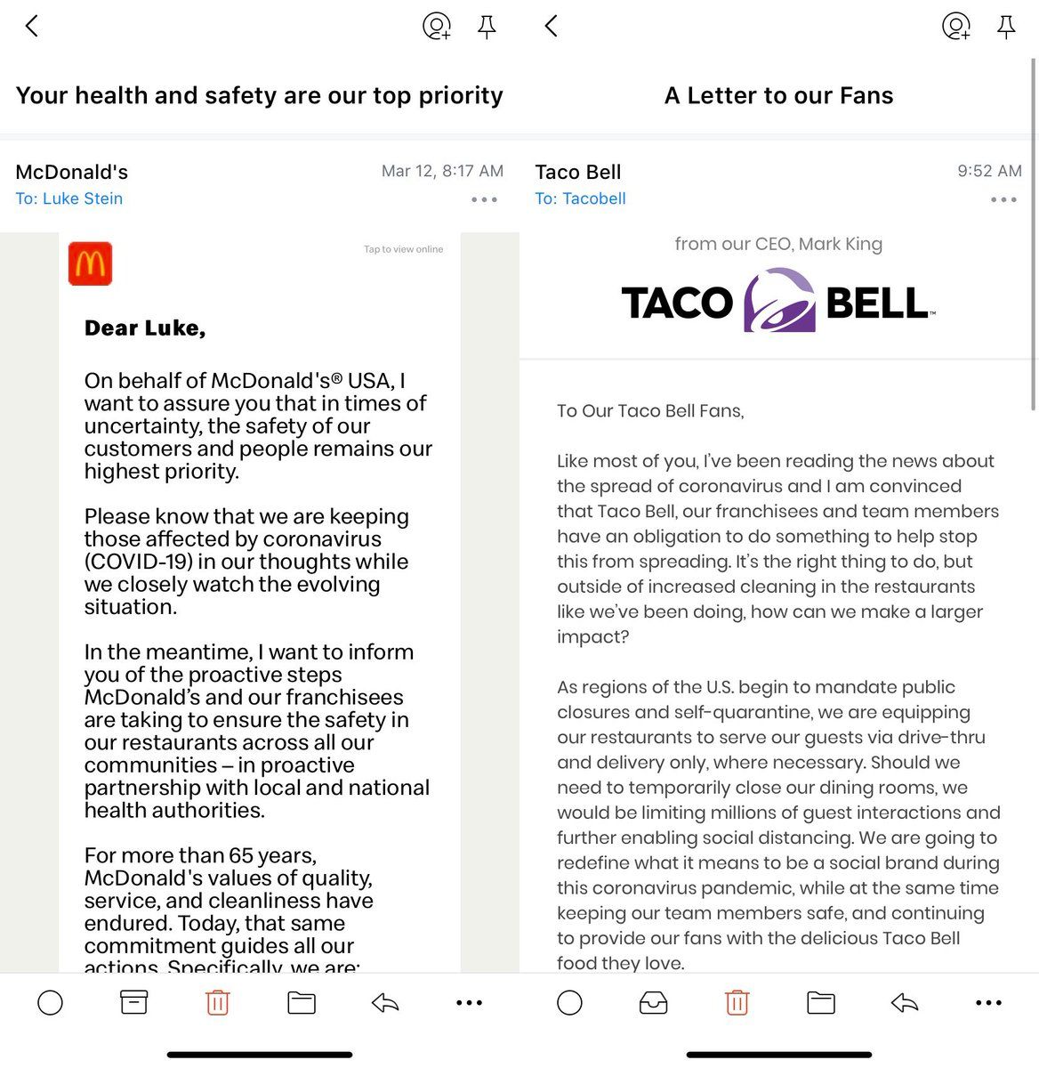 For whoever’s implementing esoteric long–short strategies based on when companies sent their #coronavirus emails: McDonald’s was 2 DAYS ahead of Taco Bell!