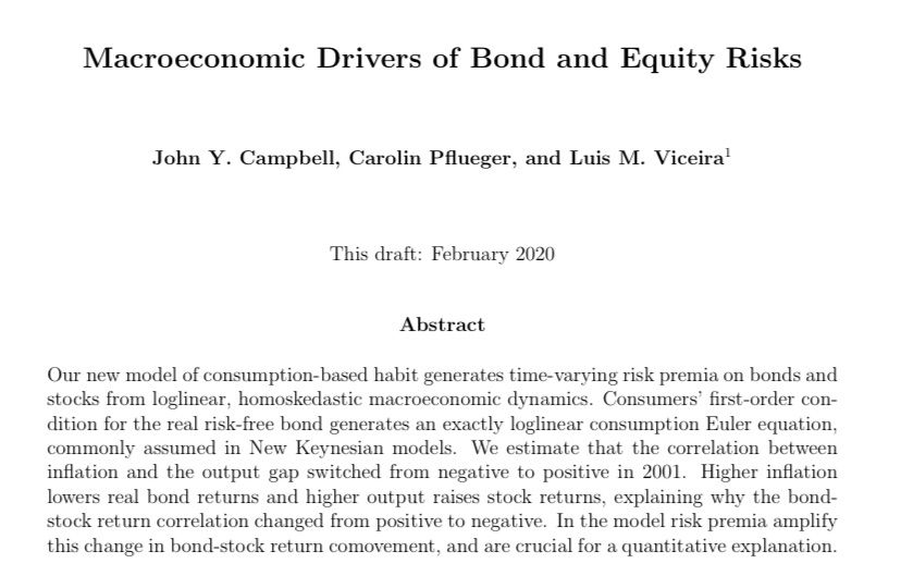 One view: Macroeconomic Drivers of Bond and Equity Risks, John Y. Campbell, Carolin Pfleuger, Luis M. Viceira (JPE forthcoming)
