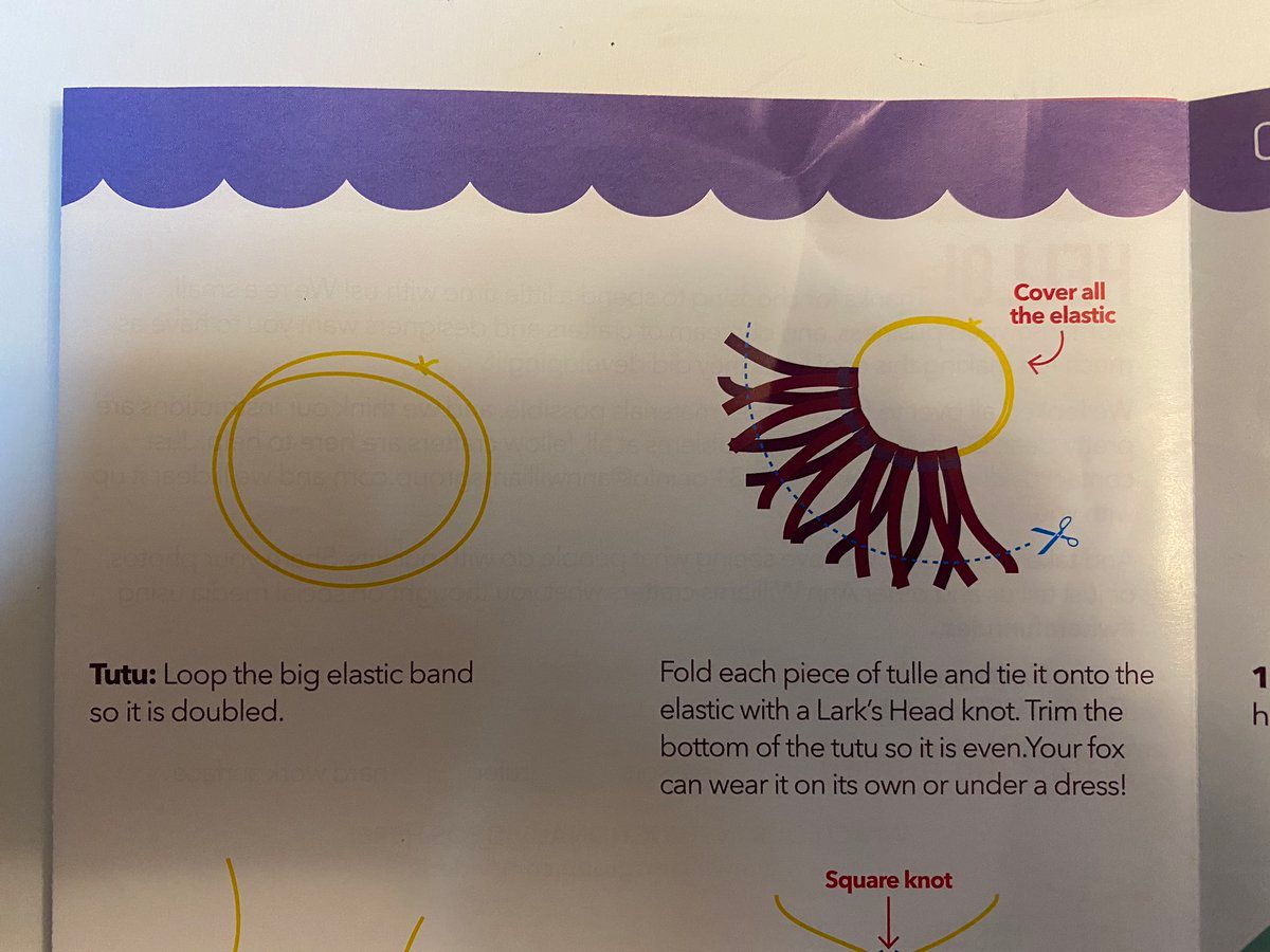 Caution: manual dexterity required to tie Lark’s Head knots in tulle may be beyond what some 6-year olds can muster