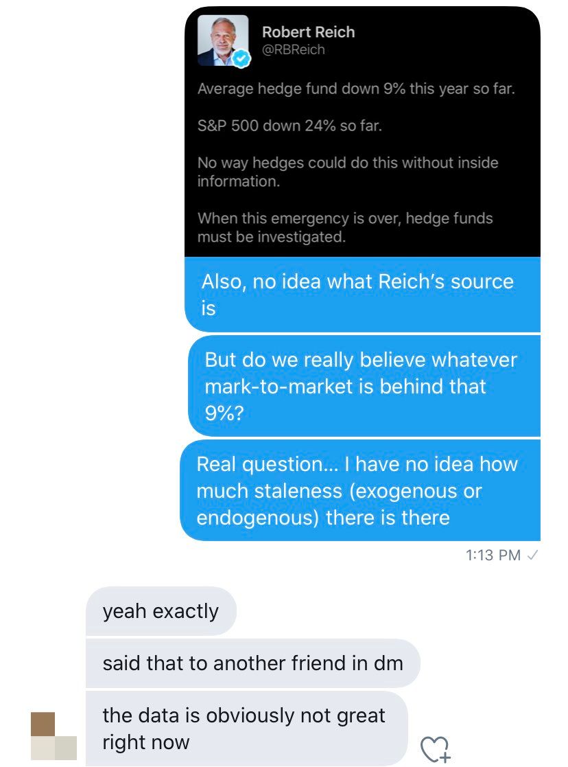 Smart people in my DM reminding me that it’s not as if hedgies are all market-neutral long–shorts. I know! I’m not expert in this literature, so: Is there really a serious argument that average/aggregate/whatever, hedge funds are beta > 1? Happy to update if my priors are wrong.