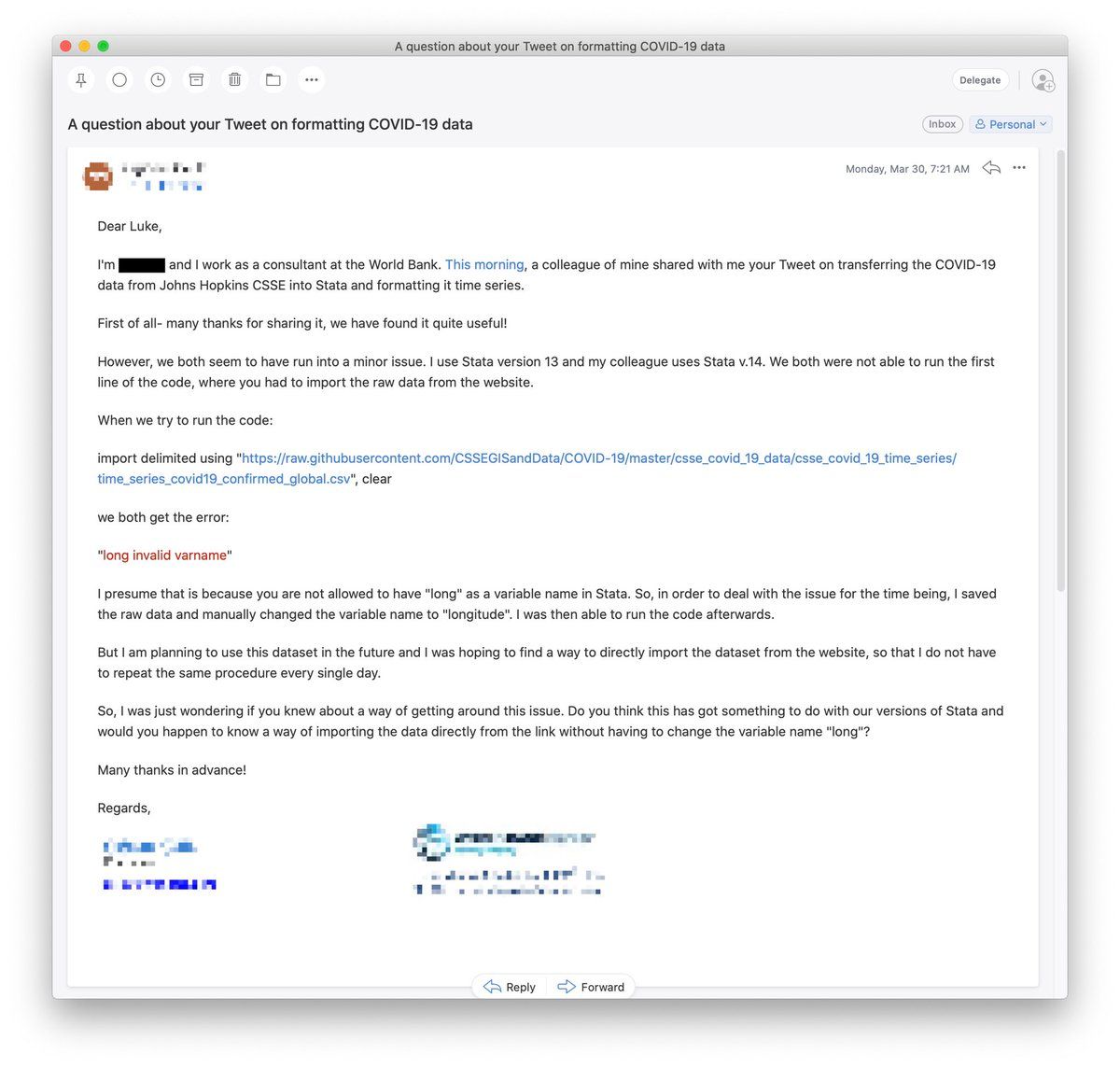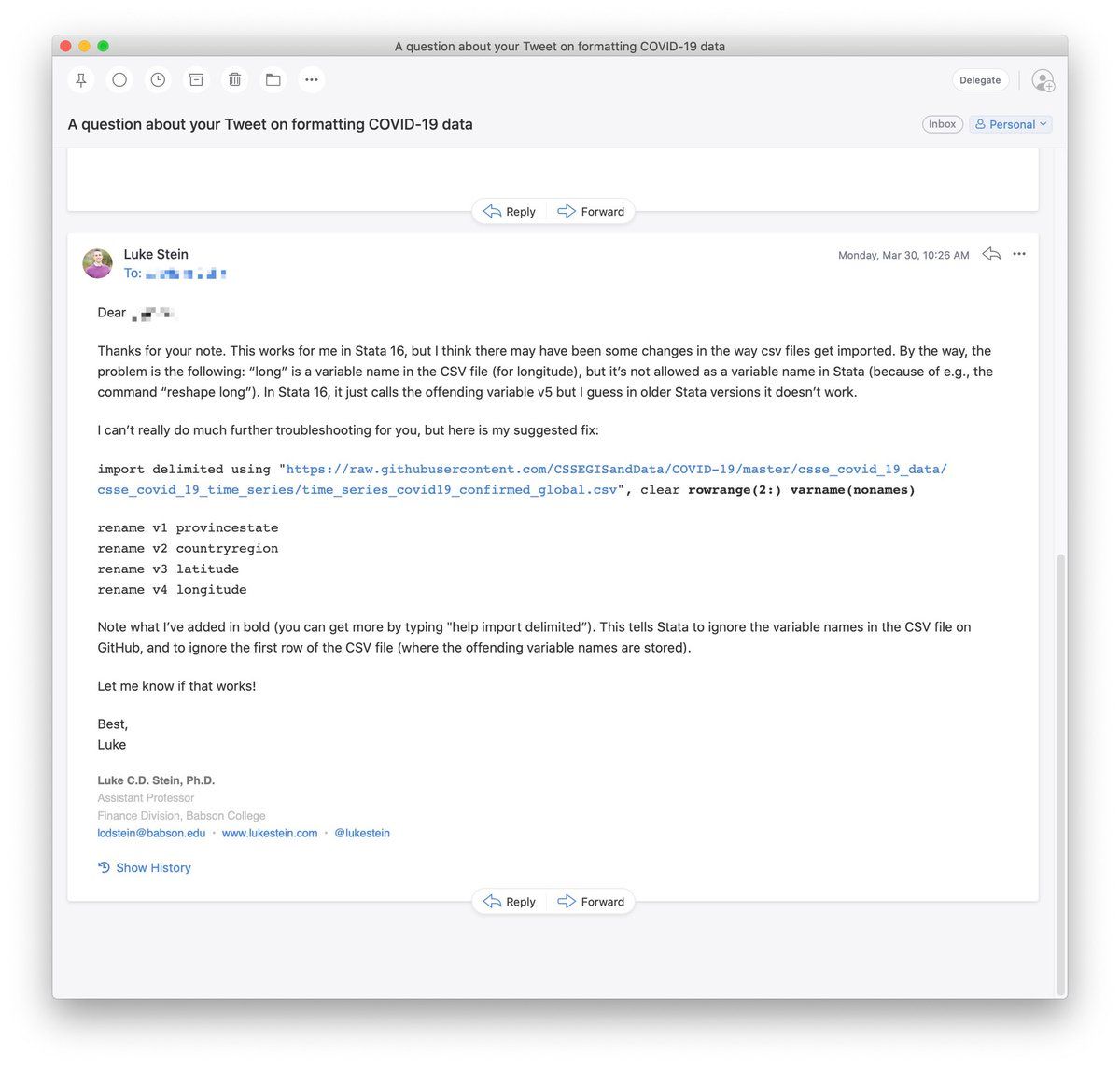 Update: Apparently older versions of @Stata don’t do as well importing csv files with unacceptable variable names. (The problem here is that the Hopkins data calls longitude “long,” a reserved word in Stata). Updated with a suggested fix: