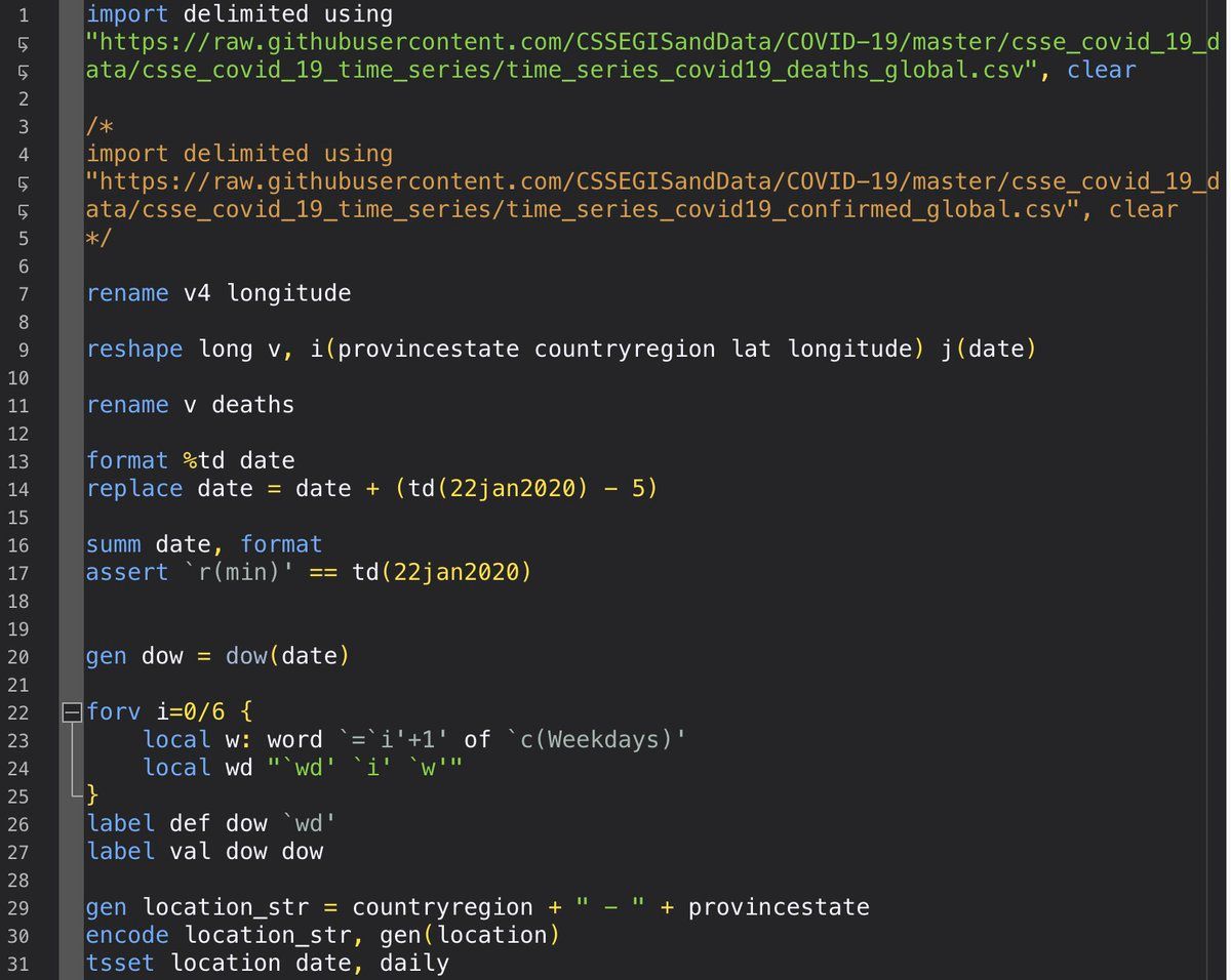 Here’s some simple code for pulling updated COVID-19 daily death data (or cases) from Johns Hopkins CSSE into @Stata and formatting as a time series: gist.github.com/lukestein/1aafbdf26cfa06e850ce6c167cd417cf This is national, except for region/province breakdowns for seven countries (not the US).