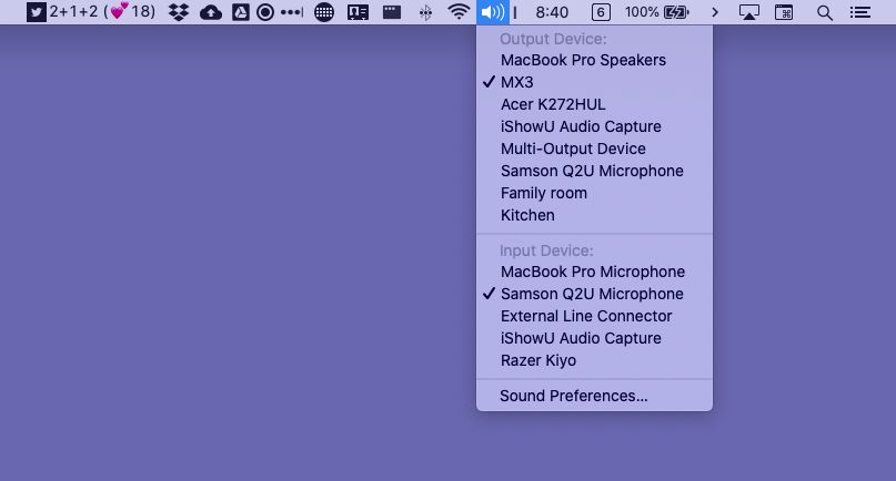 Today I learned (from @photomatt 🙏🤯) that if you hold down the Option⌥ key on your Mac when selecting sound settings, it lets you choose the input as well as the output! (Holding Option⌥ in the left image, normal click on the right)