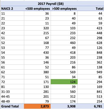 Yeah, the >500 employee restaurant/hospitality firms (green cell) would only the payroll for eligible firms (the orange cell) by ~4%.