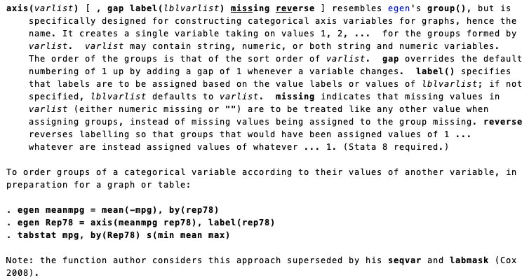 Just your annual June 3 reminder that “egen … axis(•)” is an extremely useful NJC @Stata command for graphing or tabulating categorical variables in your preferred order. (-labmask- is another great one.) @lukestein/1135731648371208192