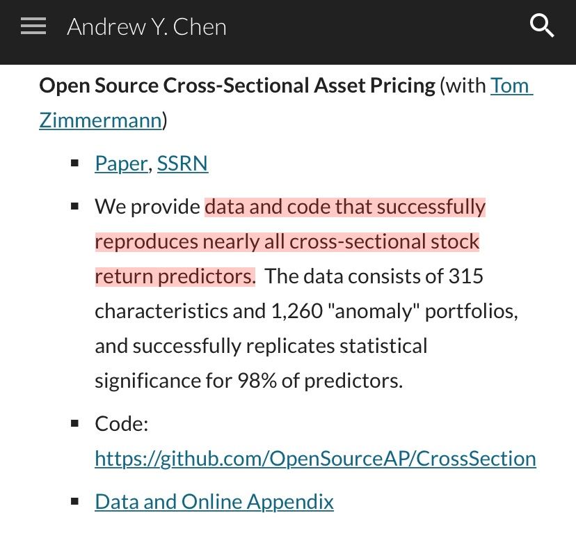 An incredible resource: Open-source code (#rstats+@Stata) and data to produce stock characteristics and “anomaly” portfolio returns. Thank you Andrew and Tom! [h/t @MarcusOwen5 cc: @Andrew___Baker] @DzielinskiMicha/1272831554260283392