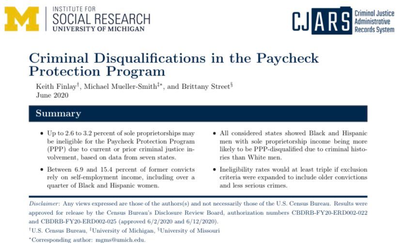 I’d hoped a paper was getting written and… it did! 👏 Keith Finlay, @Econ_Mike, and @brittanyrstreet. WP here: cjars.isr.umich.edu/wp-content/uploads/CJARS_PPP_Statistical_Brief.pdf @lukestein/1252617818673045506