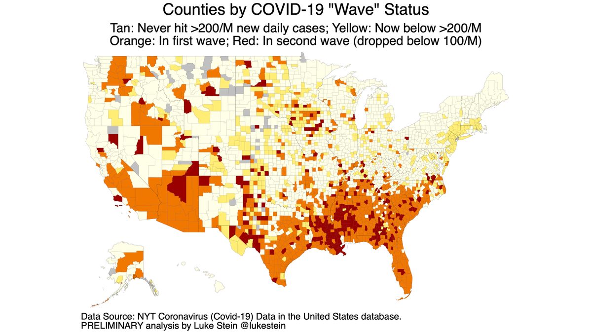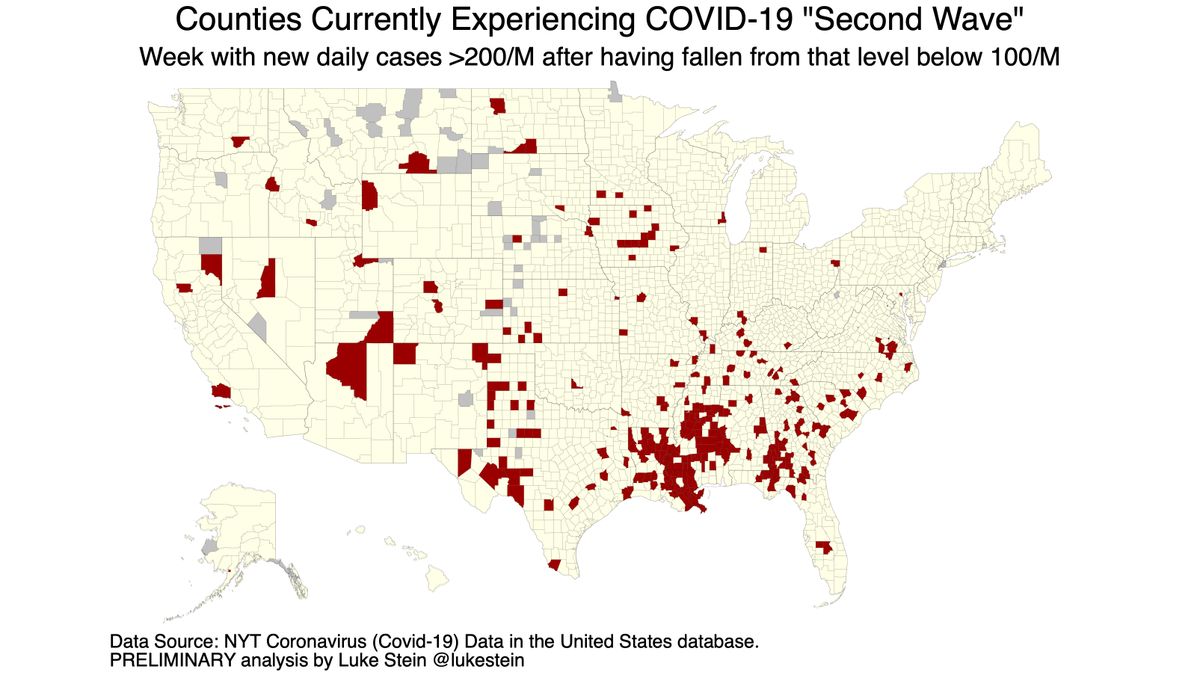 Inspired by @arpitrage's thread👇, a quick analysis of where there's now a "second wave" (defined arbitrarily here as two weeks of >200 new daily cases per M population with a week of <100 in between) @arpitrage/1285419131618164737