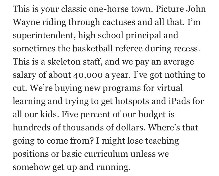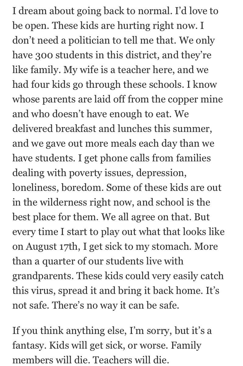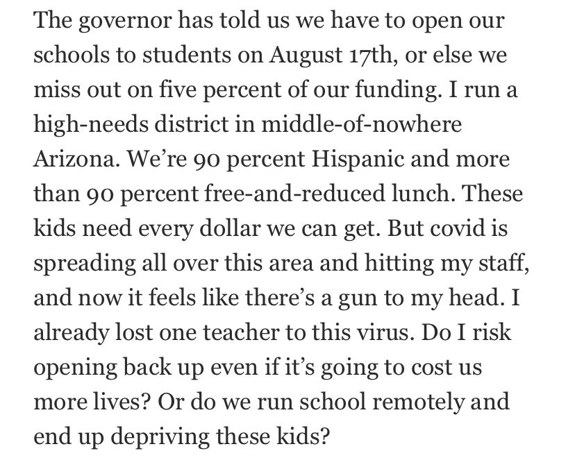 Dispatches from an Arizona schools superintendent: “The governor has told us we have to open our schools to students on August 17th, or else we miss out on five percent of our funding.” 😢😥 @dburbach/1289944638749474820