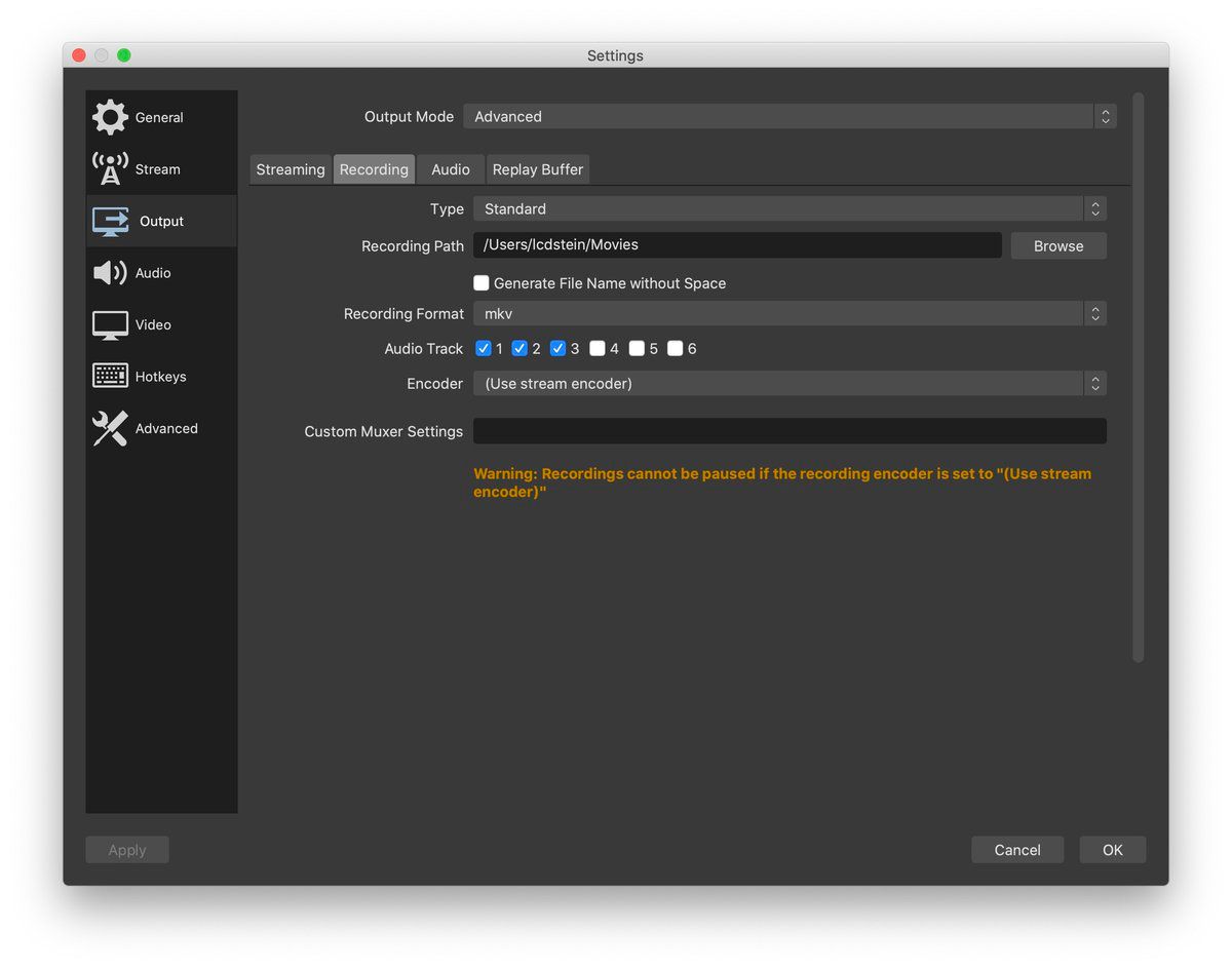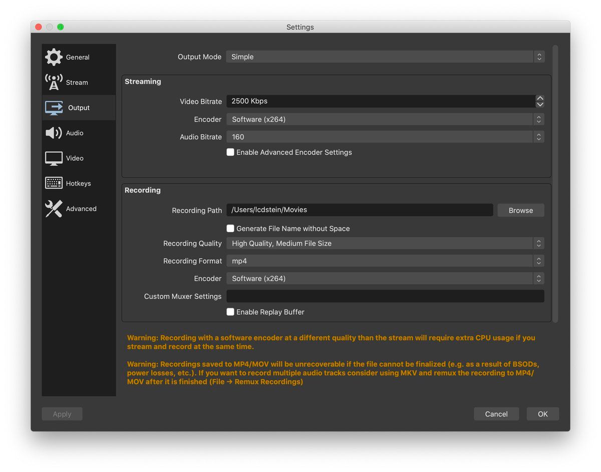 @mpelli3 @ShengwuLi @EmilyNix100 @JonathanColmer For quick, one-offs, I record direct to mp4 at 720p. (Note you can set up multiple “profiles” in OBS, so switching is then trivial.) This saves the (easy) step of converting in Handbrake, but note the second OBS warning in orange: if computer crashes, you’re f’ed.