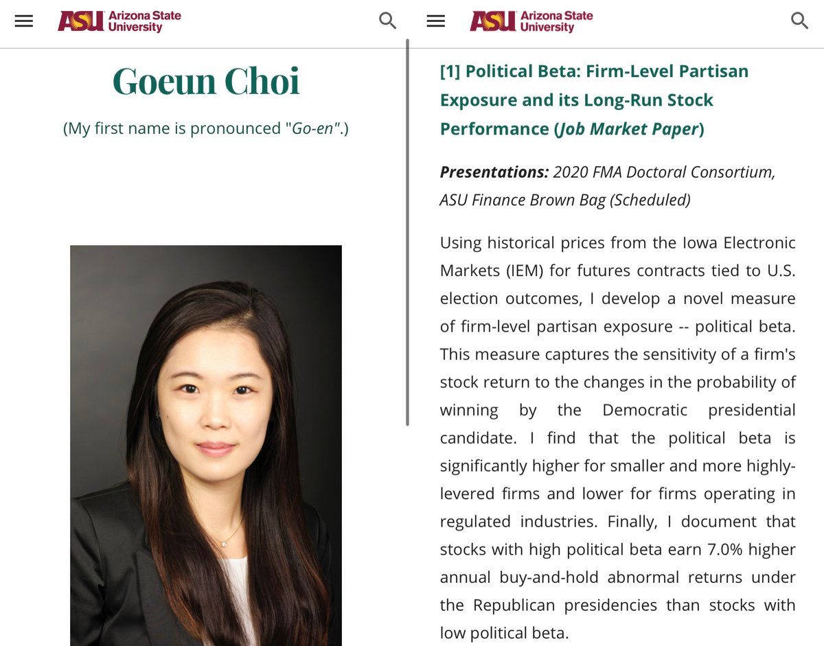 Let me point everyone towards ASU Finance’s fantastic Goeun Choi. Her JMP (soon to be available) assesses firm-level sensitivity to partisan electoral prospects, and their implications. sites.google.com/view/goeunchoi/ @snaidunl/1325133385396871168