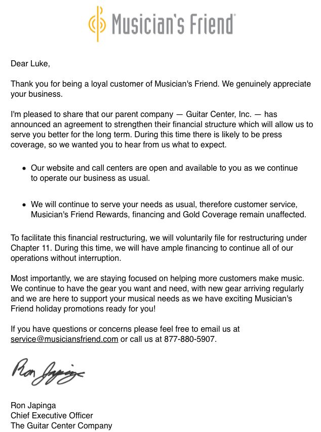 “Pleased to share that our parent company—Guitar Center, Inc.—has announced an agreement to strengthen their financial structure which will allow us to serve you better for the long term”