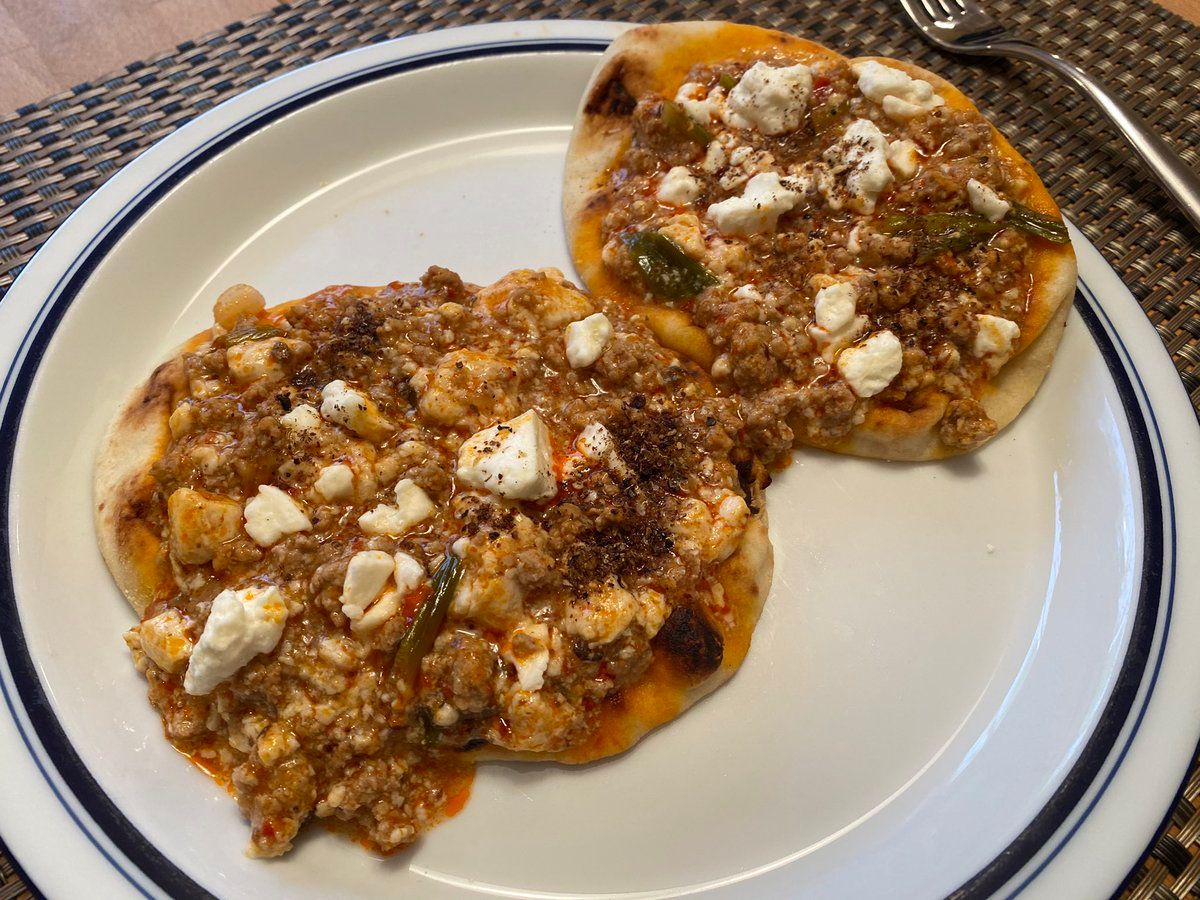 Mapo tofu × feta naan personal pizzas (recipe/loose inspiration courtesy of