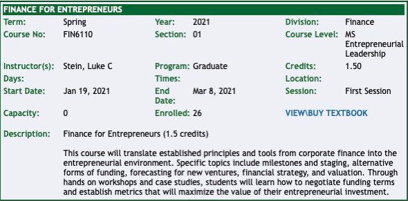 I’m definitely going to cover some basic TVM and capital budgeting tools (e.g. NPV) I’m planning for some guest speakers (though I’d consider more!)—entrepreneurs and investors But fundamentally, it’s tabula rasa, unconstrained beyond a course description (which I didn’t write)