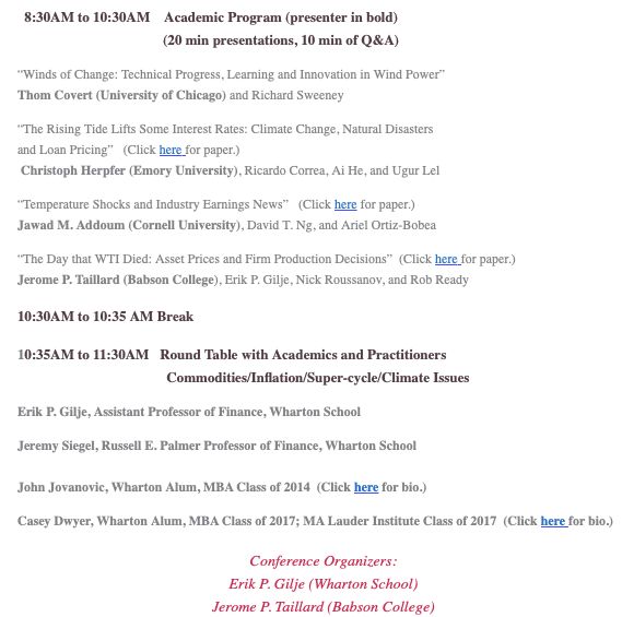 👀 short conference 𝘵𝘩𝘪𝘴 𝘍𝘳𝘪𝘥𝘢𝘺 on Climate and Commodities, coörganized by my colleague @jerometaillard and including several other friends Features 30 min. on each of four papers (by e.g., @tcovert, @HelmutPeter3, @RCorrea_econ, @ArielOrtizBobea) + a roundtable @RodneyCenter/1384901257358417923