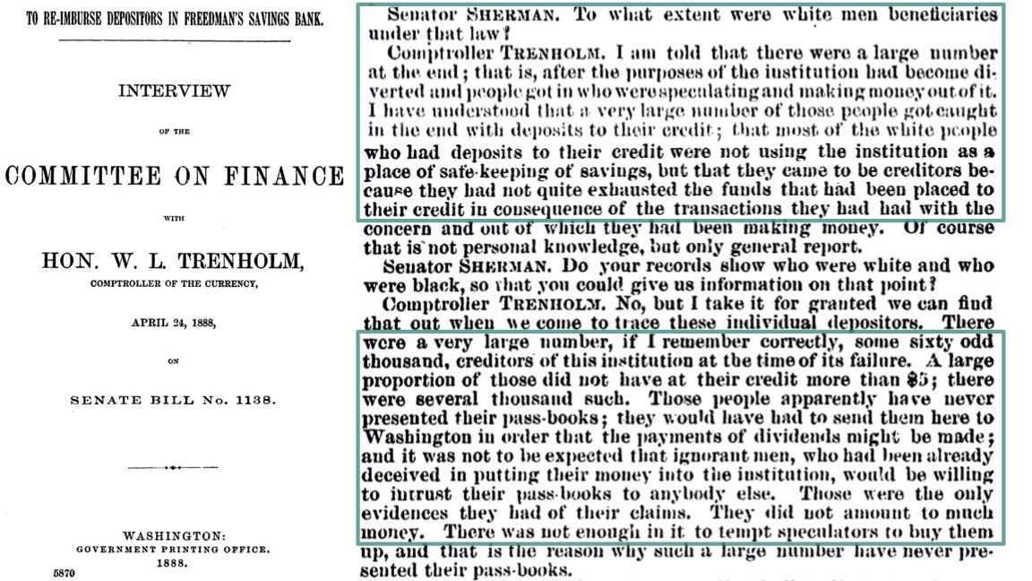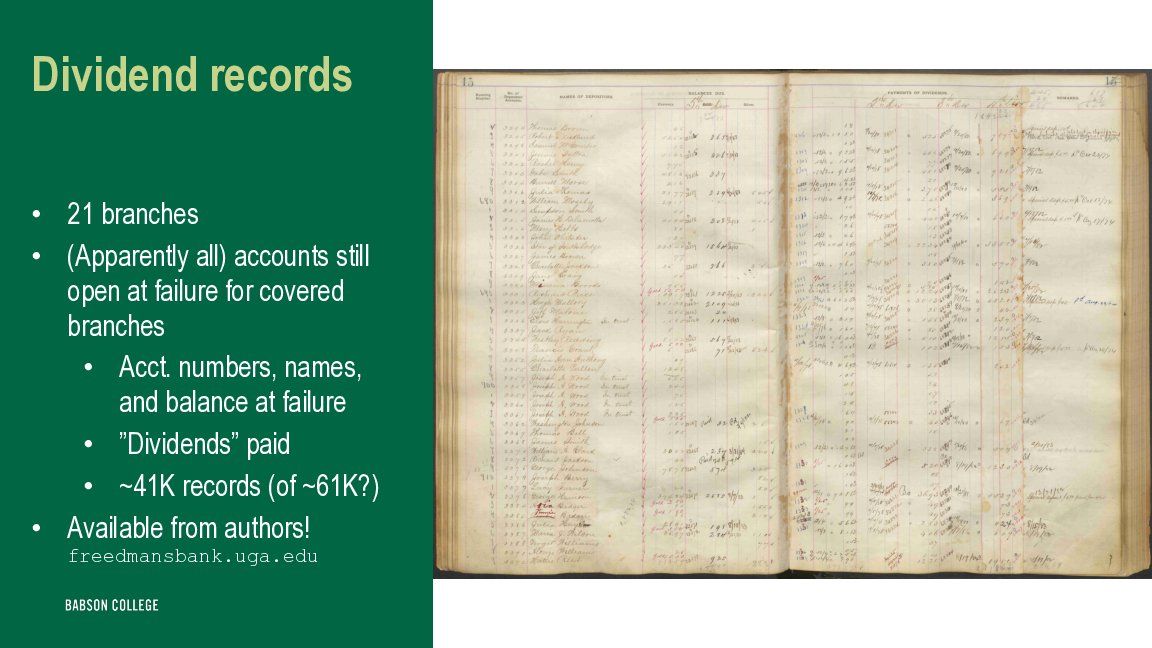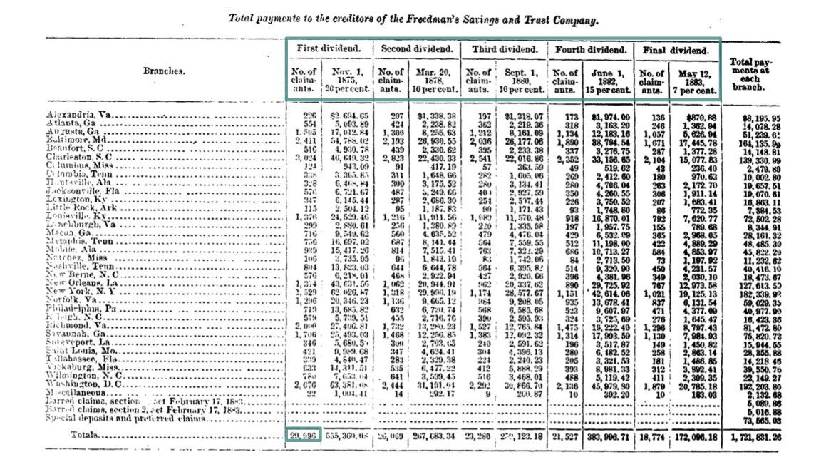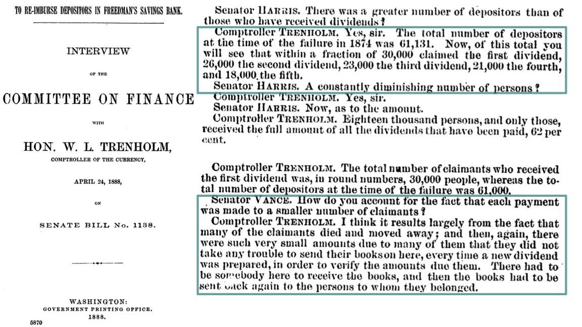 VT and MW also have (and share!! freedmansbank.uga.edu ) amazing data on who got “dividends” that reimbursed 𝘴𝘰𝘮𝘦 depositors <62 cents on the dollar in the eight years after the bank’s failure I’m really looking forward to learning more from them 4/4