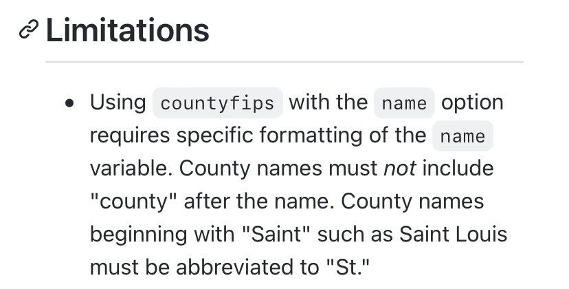 @sam_auty @cbgoodman Apparently… not flexibly Not sure what the best Stata solution for poorly normalized county names is, but if I had to deal w them I’d search a little, then ask a GIS-fluent person (I’m not), then search a lot, and finally look to build with eg RapidFuzz (Python)