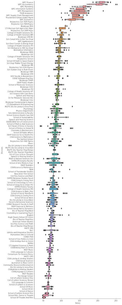 Assistant Professor salaries at a large public university by department (Pooled 2012–2020: n = 4110; 1552 unique names. Not perfect/beautiful but this is a quick graph of the FOIAable data I already had on my hard drive.) @jacasiegel/1451175743954751491