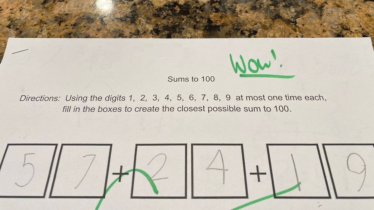 Emptying my second grader’s “Friday Folder” and tomorrow I’m definitely going to ask her to walk me through • how she found this solution and • whether we can find all the other possible solutions together 🔢