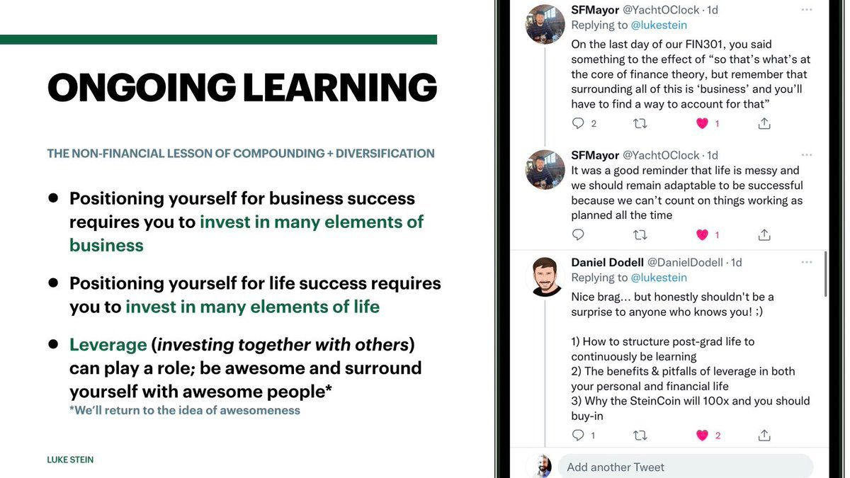 Thanks for all the advice in the replies; we had a great time last night at our @babsongsc “Last Lecture” event My theme was that finance and teaching may have some lessons for life and business and—in particular—being AWESOME On the last, I’m reflecting on @nickriggle (🧵) @lukestein/1521543505167982592