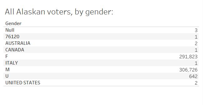 : According to the official AK voter rolls, there are actually *nine* official genders in Alaska: