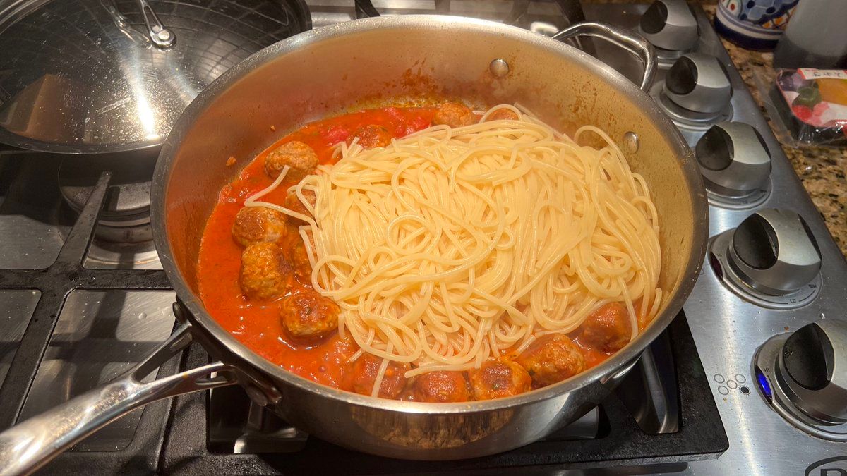 1. I sit the spaghetti on the bed of carefully prepared sauce and meatballs to celebrate it. It does not leak through because it is a carefully prepared tangle of squiggly noodles. It sits proudly atop the sauce. Respectfully.