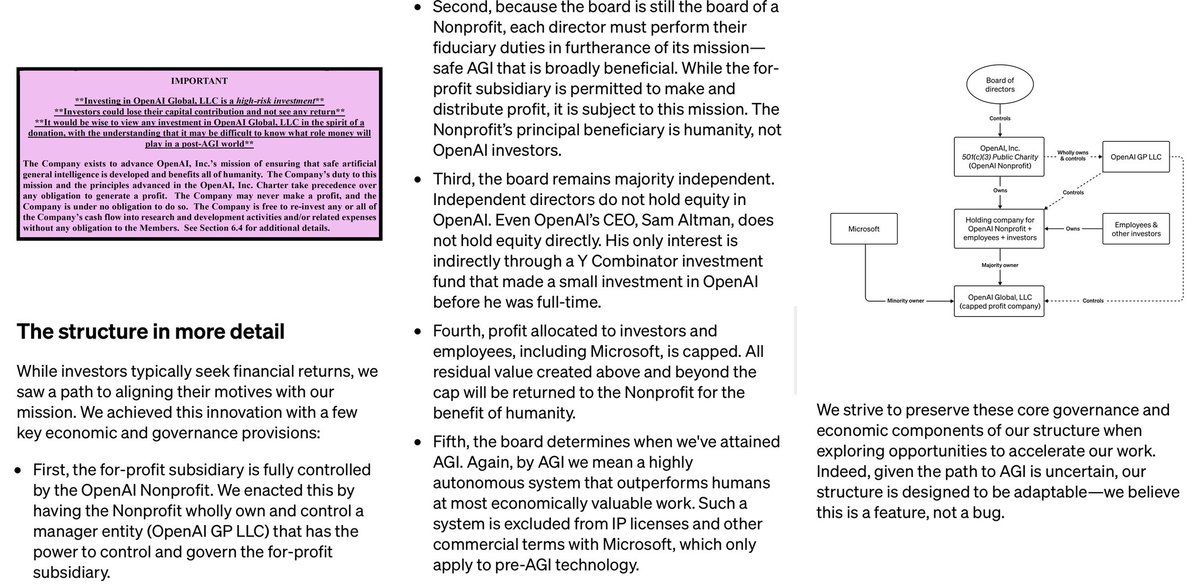 “It would be wise to view any investment in OpenAl Global, LLC in the spirit of a donation…. While the for-profit subsidiary is permitted to make and distribute profit, it is subject to this mission. The Nonprofit’s principal beneficiary is humanity, not OpenAI investors.” @jessald/1725718688555278575