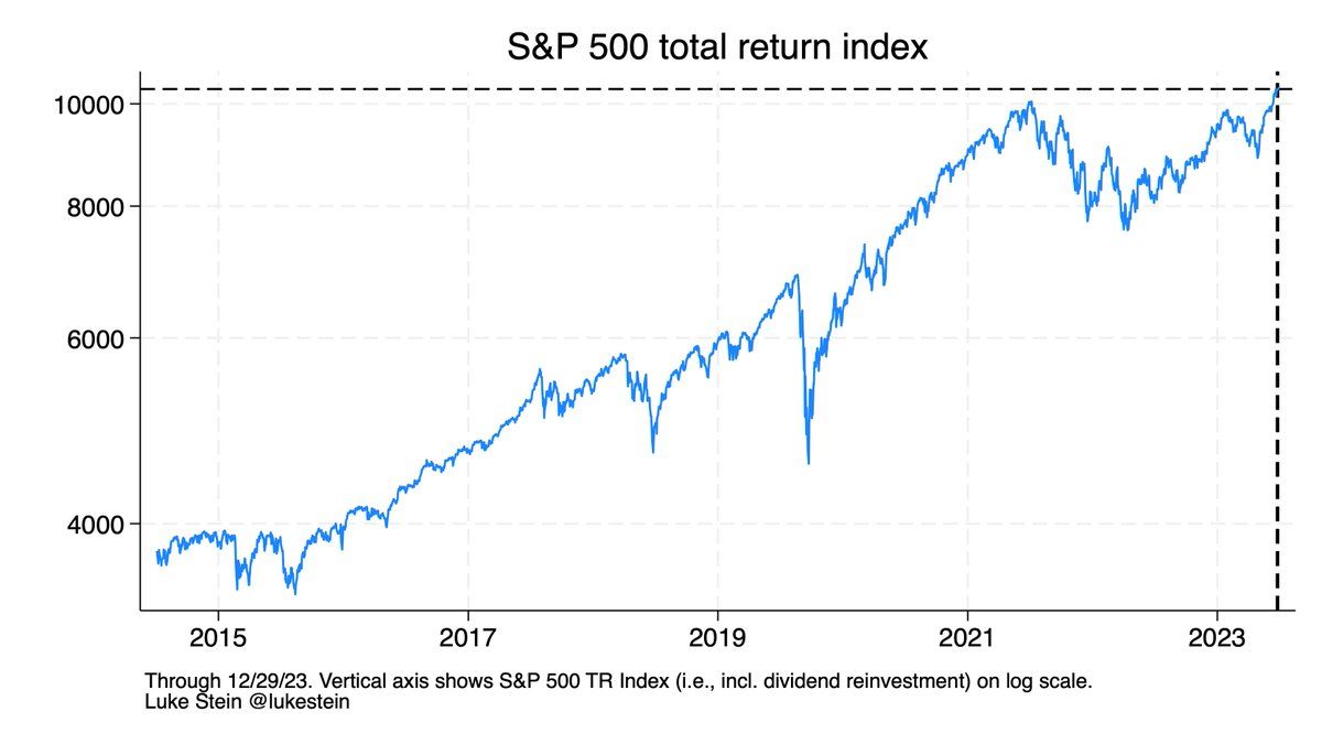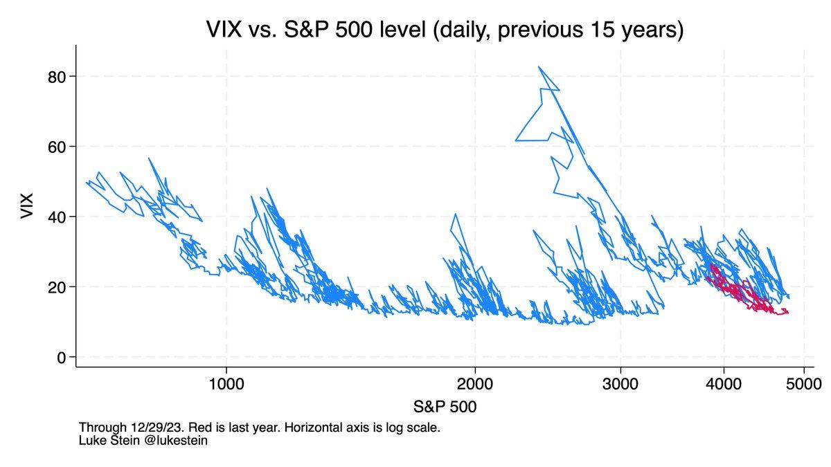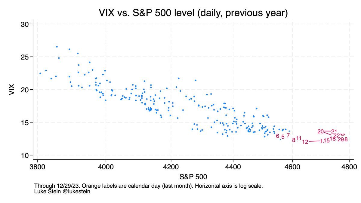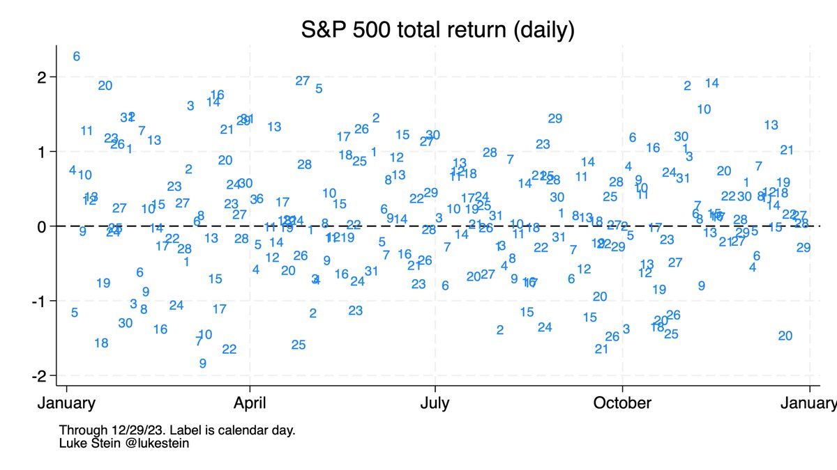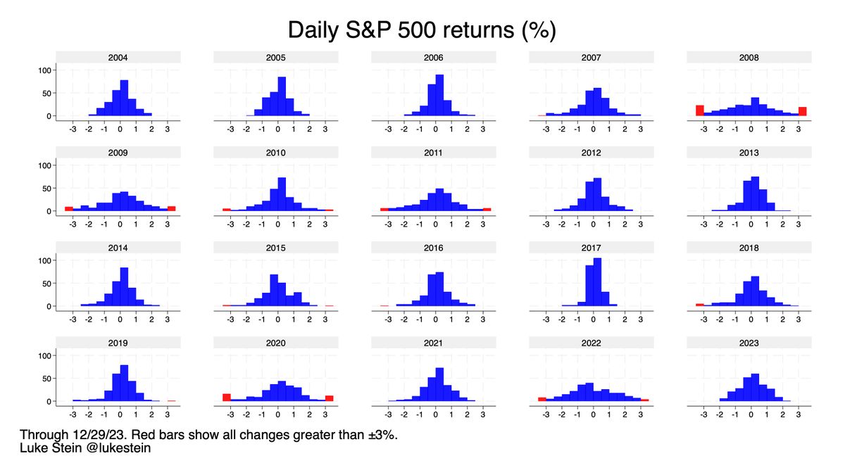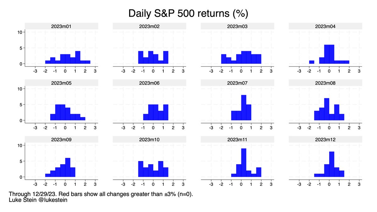 1. Your buy-and hold S&P 500 ended 2023 up no matter when you invested.* This was a year with no ±3% daily swings, and only a single ±2% (in January). The VIX (volatility index) is low. No one knows what’s coming, but lfg.